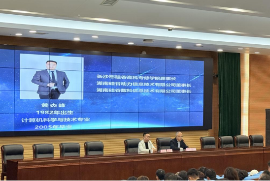 10月30日下午,必赢线路检测3003no1“校友回湘”系列主题活动在学院成功举办。本次活动以“你的未来,无限可能”为主题,特邀2005届优秀校友、长沙市硅谷高科专修学院理事长、湖南硅谷动力信息技术有限公司董事长黄杰锋重返母校,为300多名学子带来一场充满务实精神与奋斗力量的分享会。