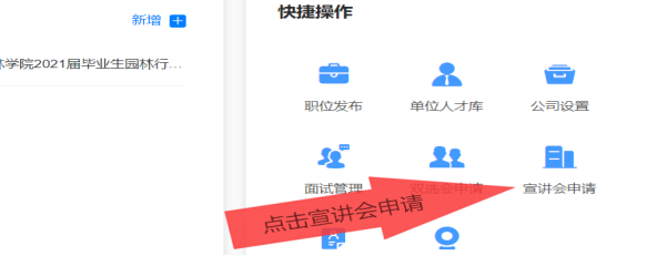 第三步:入驻审核通过后,点击“宣讲会”,进入“宣讲会”界面后,点击“申请”填写申请内容即可。