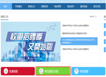 第一步:登陆必赢线路检测3003no1就业信息网(http://hncu.bysjy.com.cn/),点击“单位登陆/注册”,已注册单位单位直接登陆即可,未注册单位,可以点击“注册”,“入驻类型”可选择暂不招聘或者“在线招聘”,等待审核通过即可(1—2个工作日)