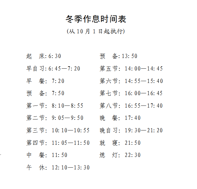 10月1日起,学校执行冬季作息时间,部分教学楼栋作息时间另行通知。