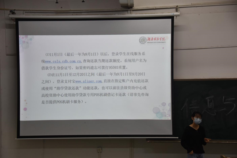 朱丽老师从国家助学贷款基本知识、借贷学生的违约责任、助学货款还款流程、毕业前需办理的事宜和常见问题解答等方面为大家作了解读。她重点强调了诚信还贷的重要性与必要性,详细讲解了学生在线服务系统以及提前还款的操作流程。
