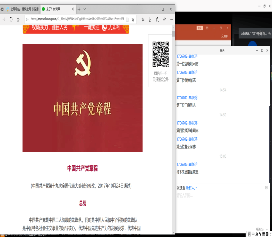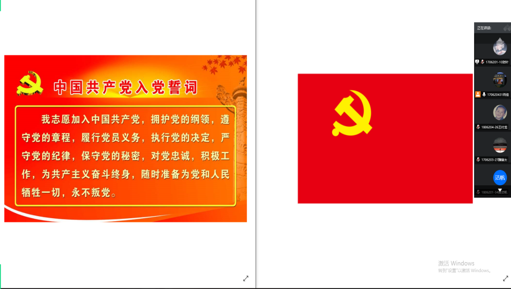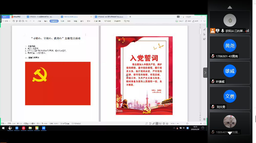 为增强党组织的凝聚力和战斗力,让党员们更加坚定理想信念、牢记初心和使命,以更加饱满的热情和奋发有为的精神投入到学习和工作中。根据学校工作要求并结合我院实际情况,于2020年6月28日下午两点半,我院学生各党支部组织了全体党员以线上会议的形式深入开展了“寻初心、守初心、践初心”主题党日活动。