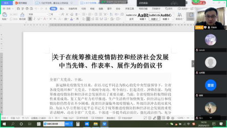 线上学习首先学习了习近平总书记在统筹推进新冠肺炎疫情防控和经济社会发展工作部署会议上的讲话并领悟习近平总书记在中共中央政治局、中共中央政治局常务委员会召开的两项会议中的会议精神。各支部党员认真学习讲话内容,清醒看到当前疫情形势,用全面、辩证、长远的眼光看待我国发展,增强信心、坚定信心。作为党员,我们应该广泛普及疫情防控知识,引导人民群众正确理性看待疫情,增强自我防范意识和防护能力,讲好中国抗疫故事。
