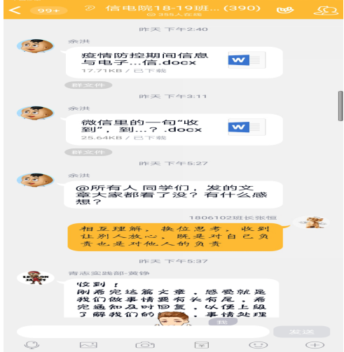 最后,余洪老师强调,新冠肺炎疫情防控工作是一场总体战,是一场没有硝烟的人民战争,需要大家上下同心抗疫、共克时艰!前方抗疫的医护工作者和解放军为了抗疫,有的牺牲了自己的生命、有的连续工作近一个月。同学们积极配合做好疫情防控工作和完成线上学习任务,就是对国家抗疫的支持,就是爱国!