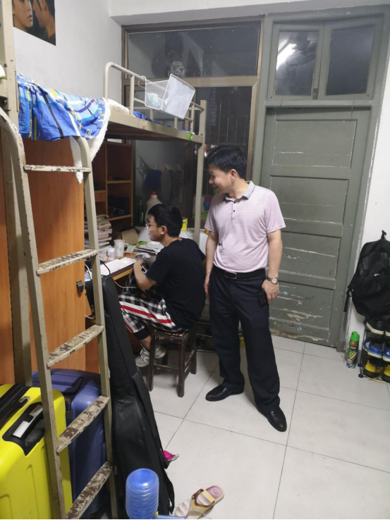首先党委书记余洪来到115寝室,在宿舍里,他仔细询问学生的状况,参考学生对学院的意见。经过亲切的交谈后,党委书记余洪对学生有一定的认识,为学生排忧解难。随后,党委书记余洪还去走访了其他寝室进行了解。他指出,学生应该管理好自己的日常生活,控制好自己的情绪,克服障碍,希望大家共同营造文明和谐的寝室环境,