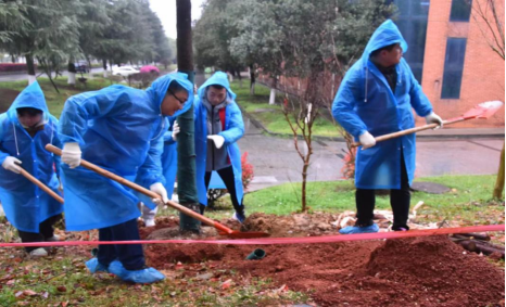 植树现场,细雨蒙蒙,大家干劲十足,相互配合,挥锹铲土,培土固苗,全然不顾鞋底和裤腿上沾满的湿泥土,齐心合力栽下一株株树木。
